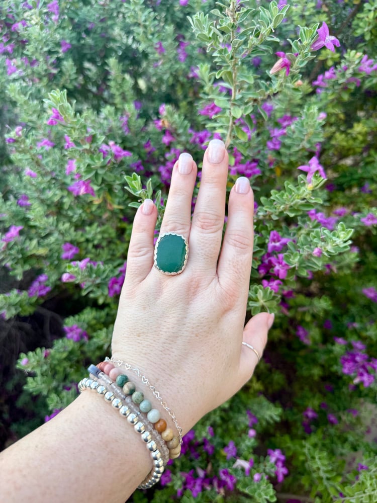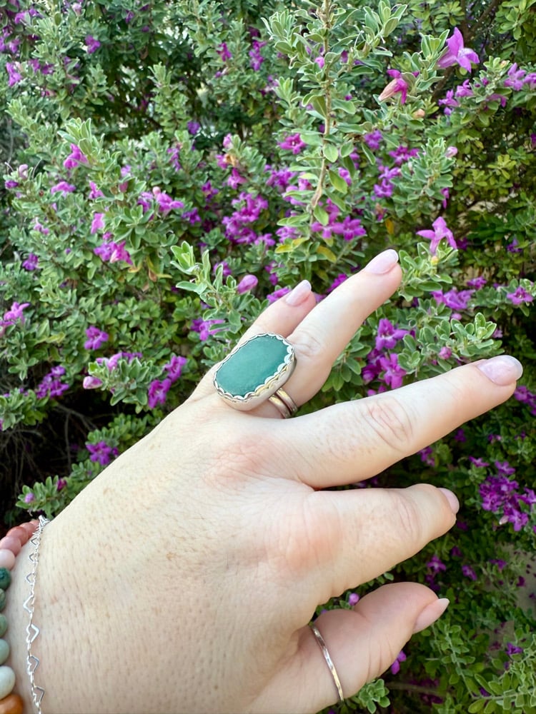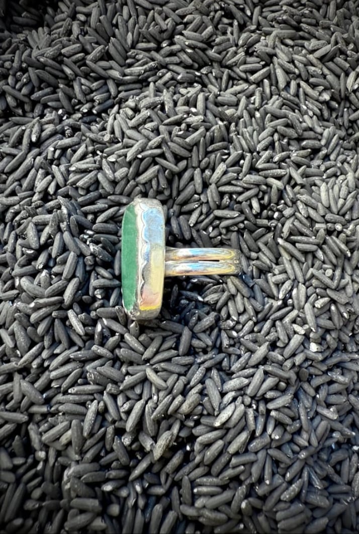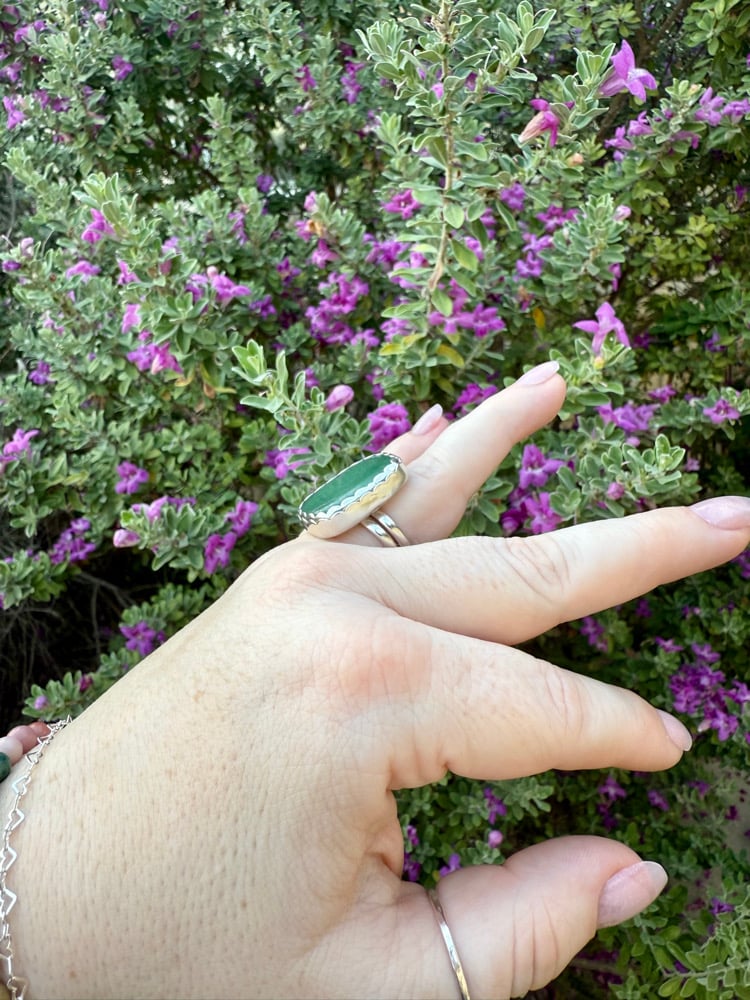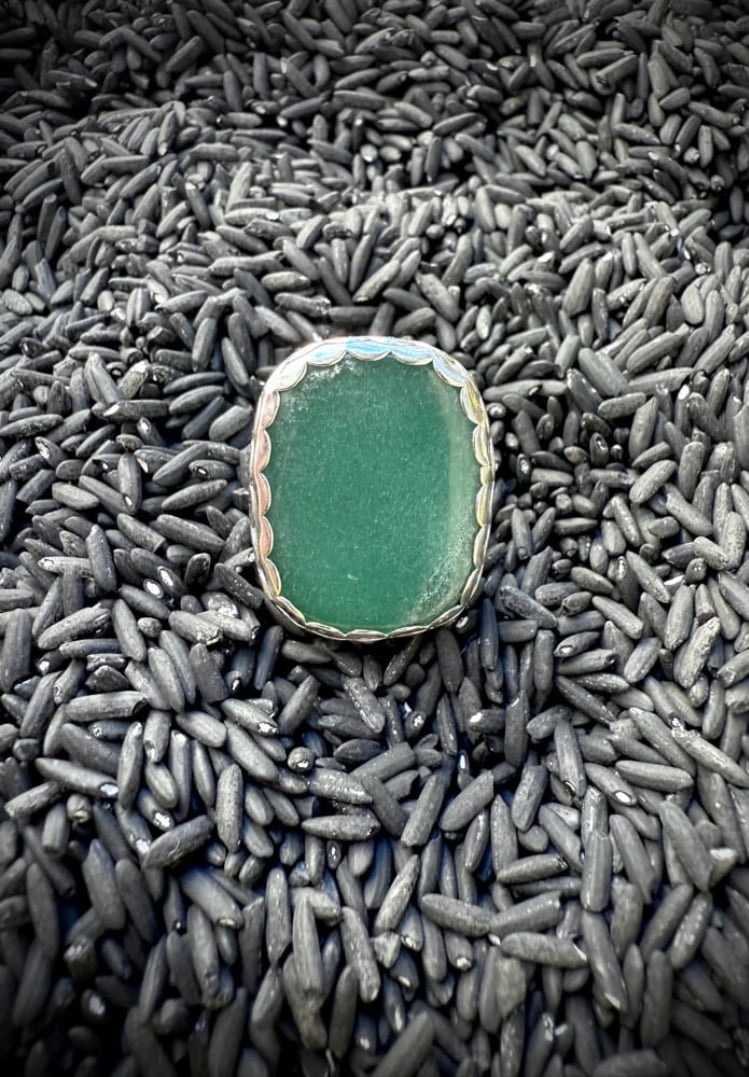 Inspired by the beauty of flowers in bloom, featuring a stunning aventurine stone set in a double bezel of sterling silver. The soft green hues of the stone are beautifully complemented by a scalloped fine silver bezel and a solid sterling silver backing with a double Ring band.