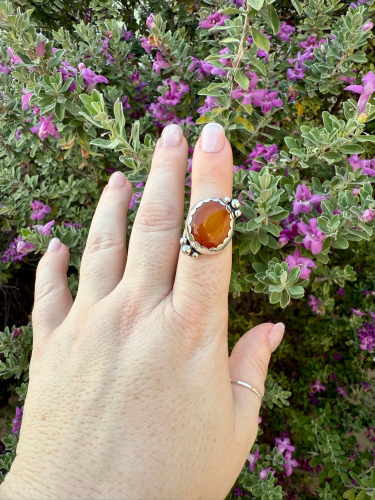This striking ring showcases a vibrant oval carnelian gemstone. The warm orange-red stone is framed by a scalloped bezel and accented with silver ball details, giving it a rustic yet elegant look.