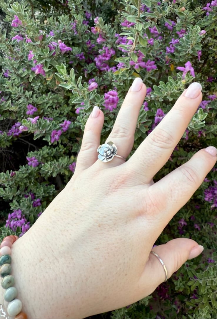 Handcrafted from sterling silver, this delicate wild rose ring features layered petals and a polished bead center. Each piece is uniquely formed by hand, making every ring one of a kind.