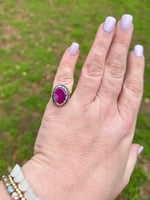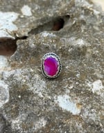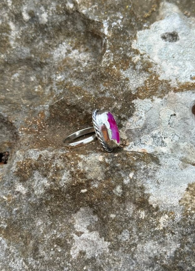 Featuring a pink agate stone wrapped in a scalloped bezel with little rope detailing.